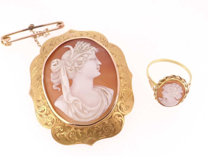 GOLD CAMEO JEWELLERY comprising 9ct gold scroll engraved carved cameo brooch, Chester 1908, together with an 18ct gold carved cameo ring, ring size S / T, stamped '750', 16.9gms gross (2)Provenance: deceased estate Swansea, consigned via our Carmarthen Office