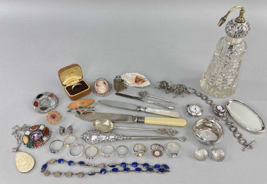 ASSORTED JEWELLERY & SILVER COLLECTIBLES, including 2 Scottish style brooches, silver atomiser, silver wristwatch, boothook, 10 semi-precious or paste set rings