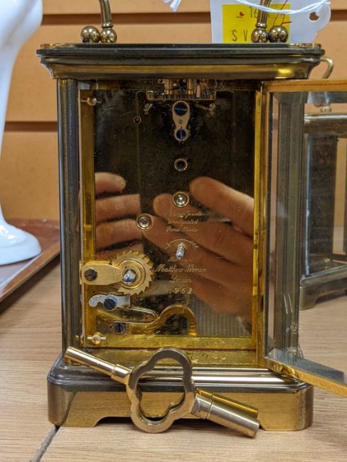 LARGE MATTHEW NORMAN BRASS CARRIAGE CLOCK, white enamel dial, 5-glass case with 11J Swiss platfom lever movement, 13.5cm h (excl. handle)Comments: case gilding worn