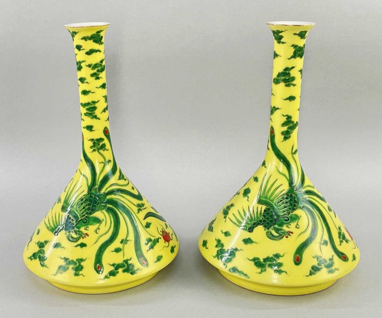 PAIR JAPANESE FUKUGAWA BOTTLE VASES, decorated in the Chinese taste with 4-clawed green dragons and phoenixes amongst clouds and red pearls of wisdom, on a mandrin yellow ground, gilt rims, underglaze blue Fukugawa Sei marks, 26cm high (2)
