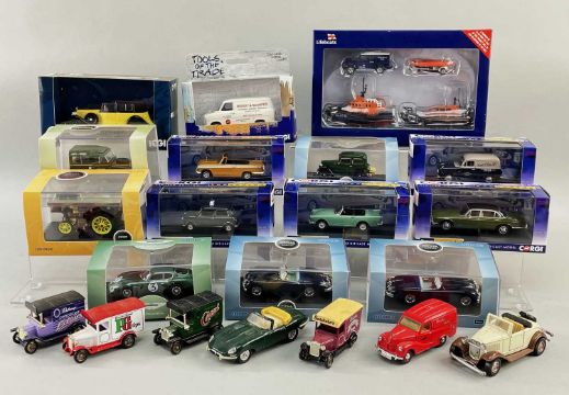 ASSORTED CORGI & OXFORD 1:43 DIECAST VEHICLES, including RNLI gift set, 'Goldfinger' Rolls Royce Phantom III, Austin Mini 850 RAF Police, Sunbeam Alpine, Triumph Herald, Jaguar XJ12 ser. 2 LWB, Ford 300E commercial Thames Van, Ford Transit Mk1, and 6 perspexed cased Oxford model vehicles and 6 unboxed various (20)Comments: boxed vehicles are mint
