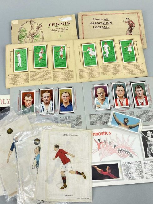 ASSORTED SPORTING EPHEMERA, including 4x Player's/Wills' albums of cigarette cards for Tennis Players in Action, Hints on Association Football, Association Footballers 1935-36, 13x League Colours printed BDV cigarette 'silks', 2x Olympics collectors albums and loose cards