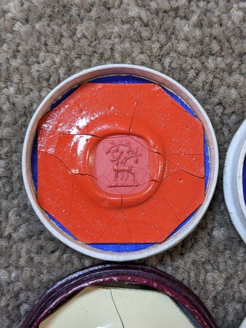 SCENT BOTTLE, BUTTON-HOLE WATCH & SEAL IMPRESSIONS, the ruby glass flask with silver hinged top by Samson Mordan & Co. (lacks stopper, one collar loop lacking), tiny Edwardian lapel watch with turquoise and diamond (?) chip bezel and blackened steel case (lacks crown), and 4x late Georgian signet ring impressions in circular boxes (5)