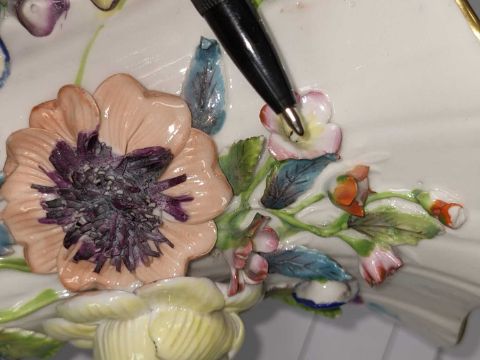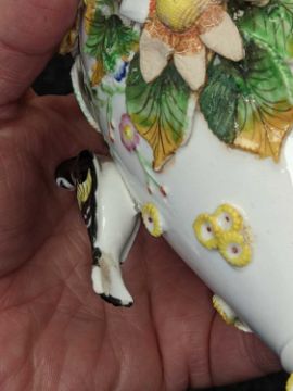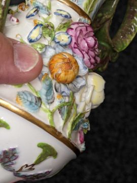 ASSORTED SPODE FLORAL ENCRUSTED BONE CHINA, comprising '4649' trumpet vase, 5.4cms high, '4659' potpourri vase and cover 14cms high, '4650' ewer 21cms high, and pair '4687' twin handled vases, 16.5cms high, a flower moulded and painted green ground ecuelle, 17cms wide (6)Comments: flared vase minor chips to metals only, all others restored/repaired