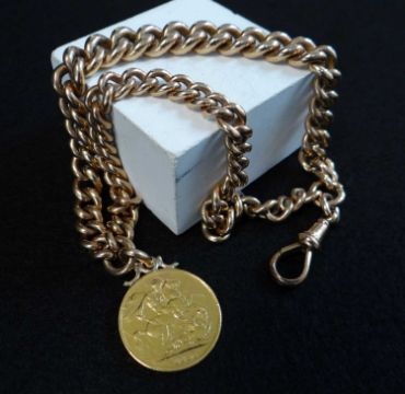 9CT GOLD CURB LINK WATCH CHAIN, having Victorian gold sovereign pendant, young head, 1886, 22cms long, 65.2gmsProvenance: deceased estate Swansea, consigned via our Carmarthen Office