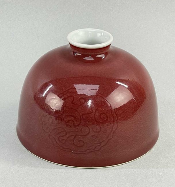 CHINESE PEACH BLOOM GLAZED PORCELAIN BEEHIVE WATER POT, Kangxi 6-character mark, sides incised with three scrolling roundels, 10.6cm diam.