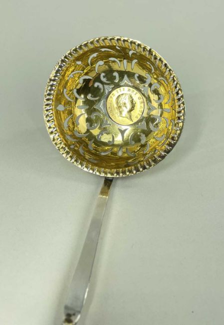 GEORGE III SILVER TODDY LADLE, the bowl later pierced and converted to a sifting spoon, AND inset with 1804 gold Half Guinea (obv. seventh laureate head right, rev. shield in garter, S.3737) , baleen handle, 27cm long