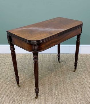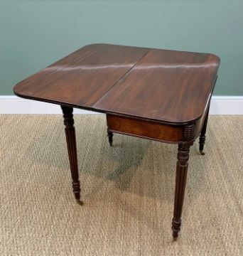 REGENCY MAHOGANY DOUBLE GATELEG TEA TABLE, double reeded foldover top above plain frieze, tapering reeded legs headed with reel moulded tablets, castors, 86cm w x 43cm dComments: one rear leg reglued, one castor damaged.