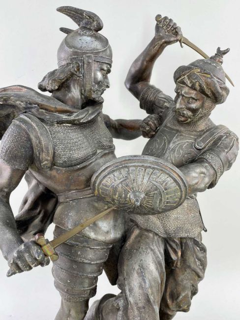 19TH CENTURY PATINATED SPELTER GROUP, of fighting Teutonic Crusader Knight and Muslim soldier, after Detrier,55 cm's high