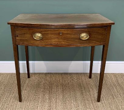 REGENCY MAHOGANY & BOXWOOD STRUNG BOW FRONT SIDE TABLE, fitted frieze drawer, on tapering square section legs, 81h x 86w x 56cmsComments: top slightly faded