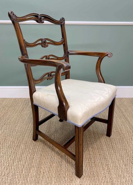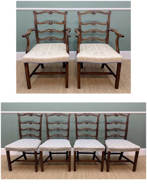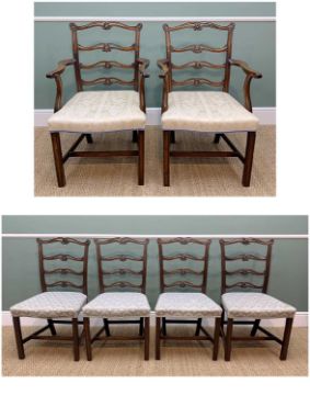 SET OF SIX GEORGE III STYLE LADDER-BACK DINING CHAIRS, moulded square section legs and uprights stuff-over serpentine seats (6)Comments: armchairs with cream damask upholstery, others with Morris-style upholstery, some minor scuffing to top rails