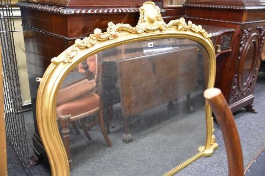 GOOD VICTORIAN GILT WOOD & GESSO OVERMANTEL MIRROR, escutcheon centred acanthus leaf and floral cresting above serpentine moulded frame with paterae brackets, 104cms high x 135cms wide Condition Report:The glass is silvered.The top and side decorations all look complete but the top has had some restoration, looks like they have been re-stuck or re-attached to the main mirror.The back boards are starting to split.