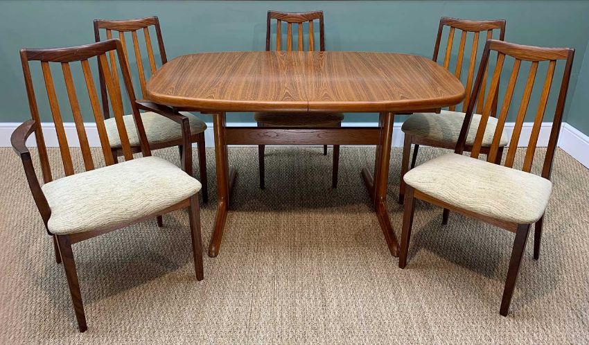MID-CENTURY DANISH EXTENDING TEAK DINING TABLE BY SKOVBY complete with four G-Plan upholstered dining chairs and one G-Plan carver upholstered dining chair (6), extended measurements 236 l x 900 w x 730cms h. Comments: minor storage marks to each table leaf, cloth upholstery stained in places.