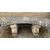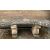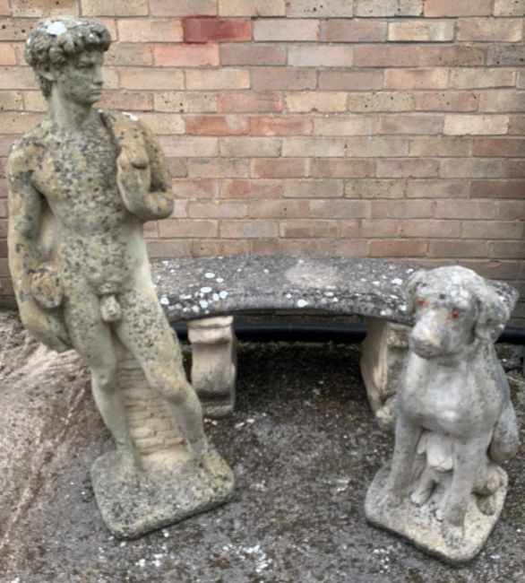 THREE VARIOUS COMPOSITION STONE GARDEN ORNAMENTS, including a curved seat bench, 128cms wide, seated hound and pups, 71cms high, and a figure of David after the Antique, 118cms high (3)