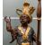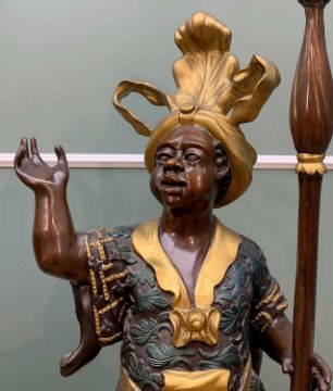 LARGE PAIR OF MODERN PATINATED BRONZE FIGURAL FLOOR LAMPS, as children, holding staffs, wearing elabrorate turbans and ornamented costumes, on cruciform bases, 151cms highComments: non matching associated frosted flame shaped shades