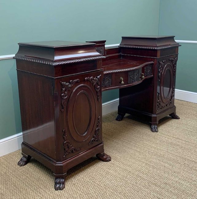 LATE VICTORIAN MAHOGANY PEDESTAL SIDEBOARD with oval applied cupboard doors, gadrooned edges and bow-front section fitted with drawer, 1112h x 198w x 60cms