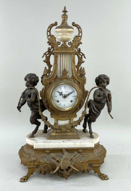 MODERN ITALIAN 19TH CENTURY-STYLE MARBLE & GILT METAL MANTEL CLOCK, of lyre form with flanking satyrs holding flower garland, dial signed Imperial, German FHS 8-day movement striking 2 bells, 64cm high