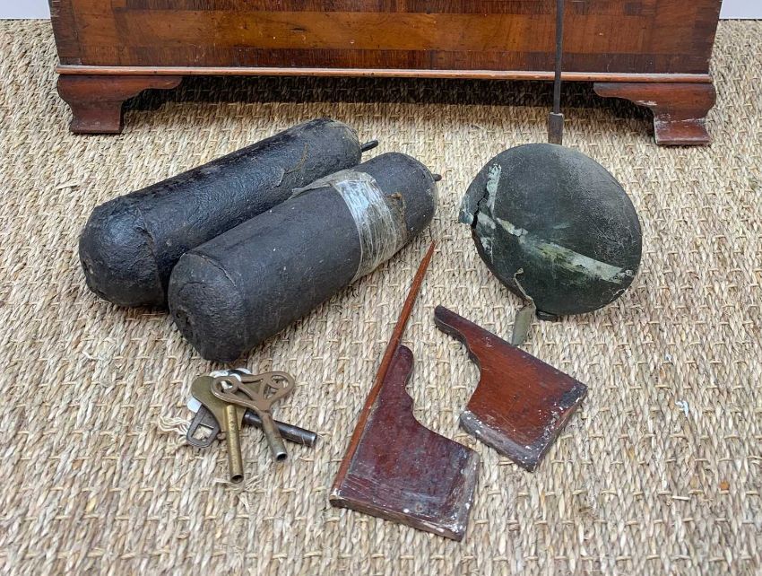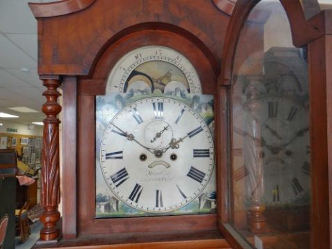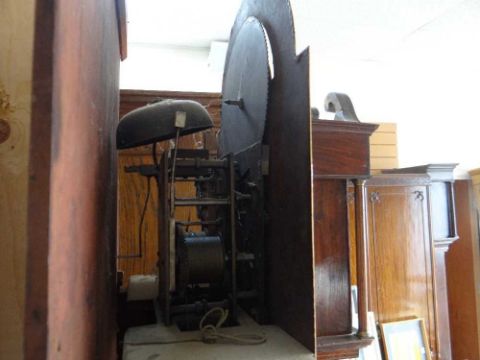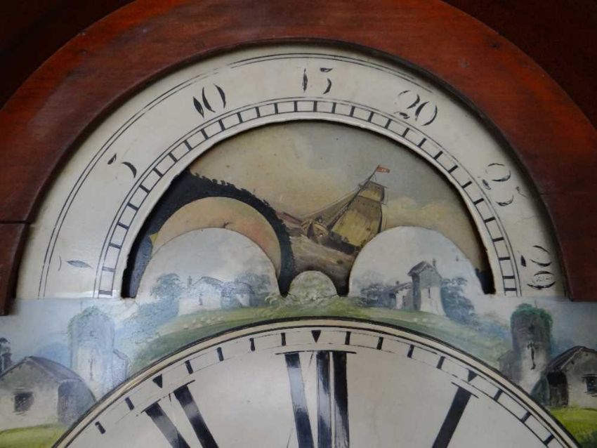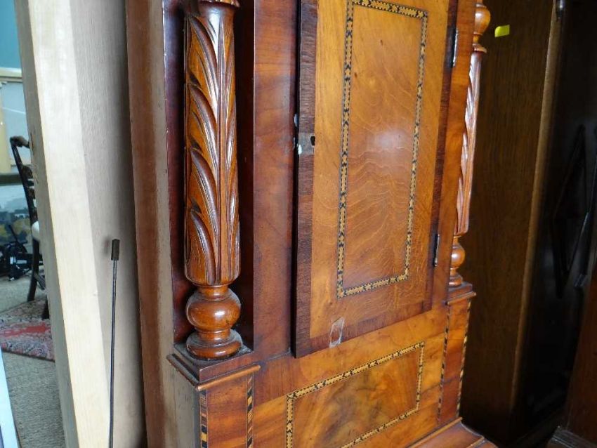 EARLY 19TH CENTURY SOUTH WALES WALNUT LONGCASE CLOCK, Meredith, Merthyr Tydfil, painted twelve inch moon phase dial, subsidiary seconds, calendar aperture, break arch good and leaf carved columns, marquetry inlaid case, cross banded base, short bracket feet, 229cms highComments: some veneer losses, bracket foot repaired, dial worn, pendulum bob damaged, pendulum spring missing,movement in need of restoration.