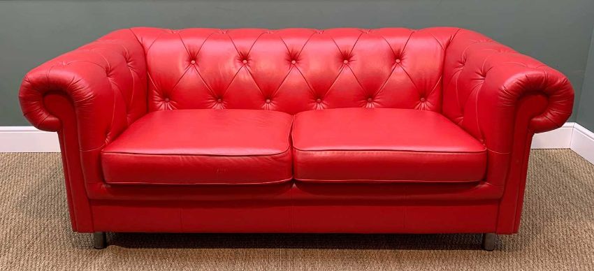 PAIR MODERN VICTORIAN-STYLE BRIGHT RED LEATHER UPHOLSTERED CHESTERFIELD SOFAS, on steel legs, 191cms wide and 210cms wide (2)