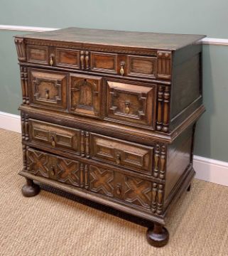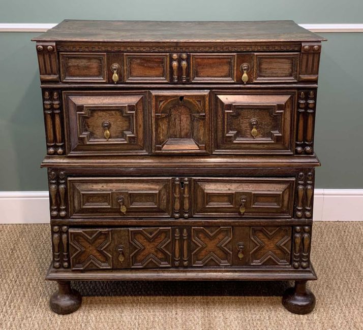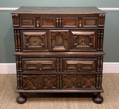 LATE 17TH CENTURY JOINED OAK & GEOMETRIC FRONTED CHEST, boarded top above four long drawers with spindle uprights and central arched door panel, raised on compressed bun feet, 103h x 100w x 58cmsComments: top with splits, surface colour cleaned in areas, some replacement boards