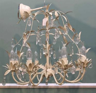 MODERN FACETED PERSPEX STANDARD LAMP WITH BRASS BASE, and painted floral metal and perspex dropped eight light chandelier (2)