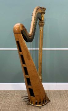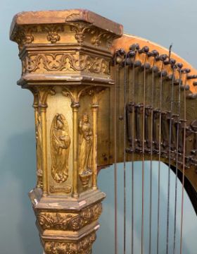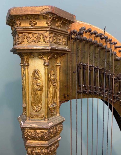 SEBASTIAN & PIERRE ERARD GOTHIC HARP, early 19th Century, birds eye maple and gilt gesso, seven pedals, gothic column ornamented with figures of Saints and angels, signed gilded brass plates, 174.5cmsComments: needs re-stringing, some gesso chips
