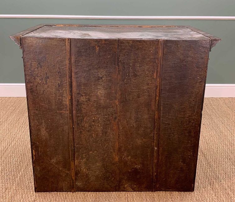 GEORGE III OAK TALLBOY CHEST, dental cornice and blind fret, carved frieze above three short, three graduated long drawers on a chest with brushing slide and three graduated long drawers, bracket feet, 190h x 113w x 56cmsComments: sides with restored shrunk timbers, top and backboards with old woodworm, otherwise good