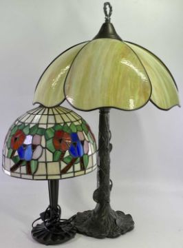 REPRODUTION TABLE LAMPS x 2, both having Tiffany style shades, 48cms and 75cm heights, the larger display only, E/T.