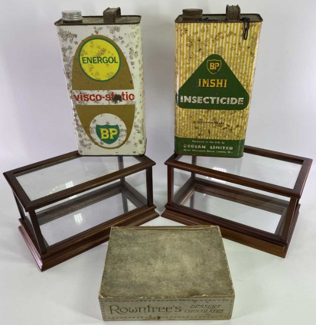 SLATE PLACEMATS - various sizes and shapes, circular, approximately 27cms diameter, square 31cms, a pair of glass and wooden model display boxes, 17 x 31 x 18cms (2) and an old Rowntrees dessert chocolate box and two vintage BP cans