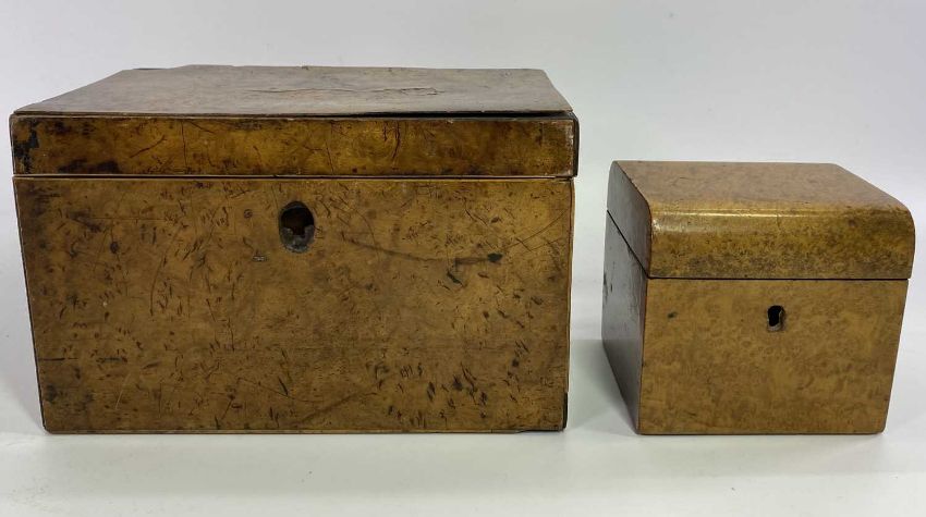 BURR WALNUT BOXES x 2 to include a workbox, 16cms H, 26cms W, 16cms D and a similar tea caddy, 12cms H, 12.5cms W, 11cms D