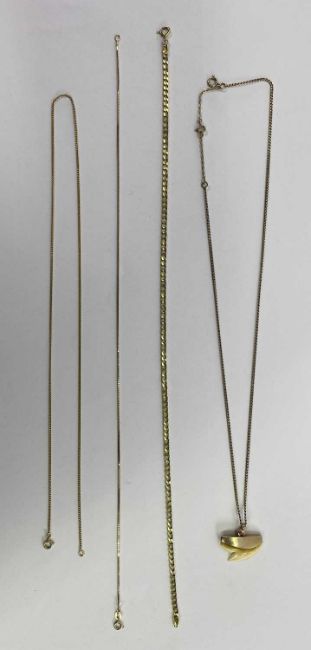 9CT GOLD MOUNTED SHARK TOOTH PENDANT NECKLACE, 31cms L closed, and three others, a nine carat gold flat link necklace, 35cms L open, ten carat gold fine box link necklace, 35cms L open and one other fine link necklace with indistinct marks, but believed gold, 54cms L open, 18.1grms gross