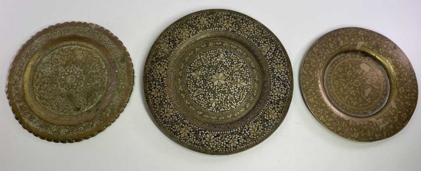 PERSIAN STYLE BRASS & OTHER METAL TABLE TOPS (2) & PLAQUES (3) - 60cms the largest, 24cms the smallest, two further items