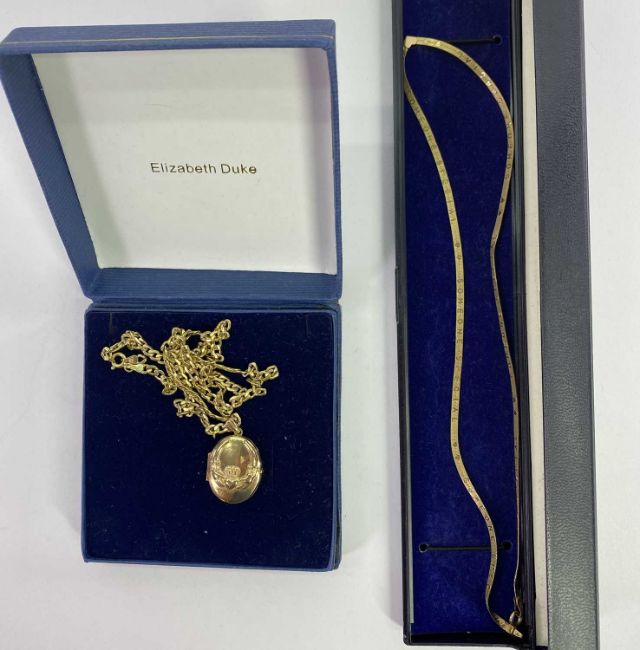 TWO 9CT GOLD NECKLACES including a flatlink example with central heart and the words "Someone Special" repeated along the necklace, 40cms L open, the other with nine carat gold locket having a heart in hands front decoration, on a flat curb link Italian necklace, 45cms L open, 6.9grms gross