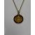 DIAMOND & RUBY SET CIRCULAR PENDANT on a nine carat gold fine link necklace, the pendant unmarked but believed gold, 12mm diameter with an enclosed circular band of baguette cut rubies, having a central circle set with five small diamonds in the form of a cross and two small enclosed baguette cut rubies with the words "Qu'hier" above and "Que Demain" under (translated to "I love you more than yesterday and less than tomorrow"), 23.5cms overall L, 4.4grms gross