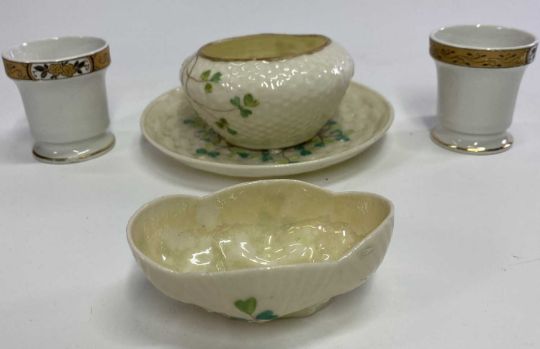SHIPPING INTEREST EGG CUPS (2) and three items of Belleek shamrock decorated porcelain, the egg cups in white with floral and gilt top banding stamped 'The Cunard Steamship Company Ltd and Booths Ltd Silicone China England' patent No 14095