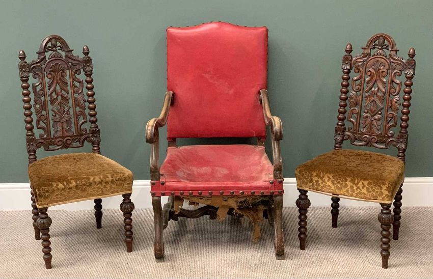 VICTORIAN CARVED MAHOGANY HALL CHAIRS, a pair, on bobbin supports, 105cms H, 48cms W, 40cms D and a similar period elbow chair, 107cms H, 63cms W, 53cms D
