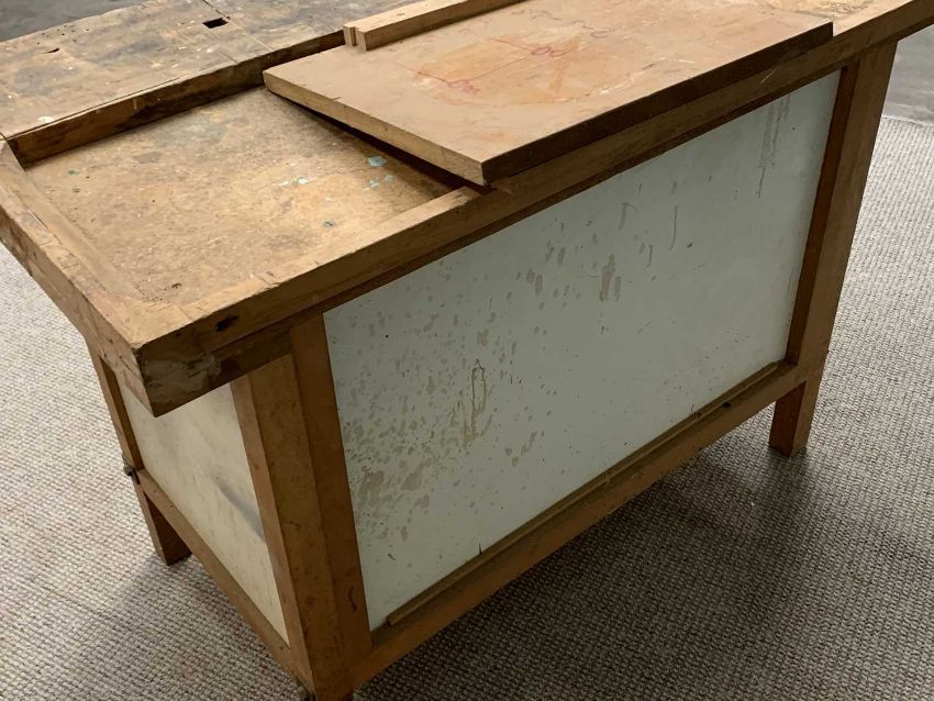 WORKBENCH, an excellent example with end vice and sliding lower doors, 82cms H, 141cms W, 60cms D