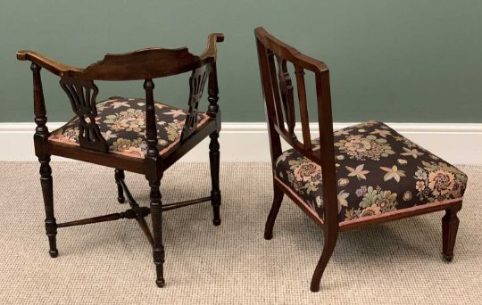 VICTORIAN INLAID CORNER CHAIR, fine example and a nursing chair, believed to be manufactured by Oetzmann and the seats upholstered in a Liberty Wykeham fabric