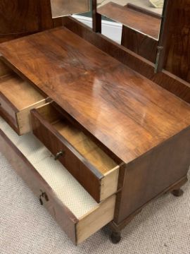 VINTAGE MAHOGANY BEDROOM SUITE comprising dome top single door wardrobe, 195cms H, 120cms W, 48cms D, a smaller lady's wardrobe with base drawer, 149cms H, 79cms W, 42cms D and a three drawer mirrored dressing chest, 157cms H, 106cms W, 50cms D