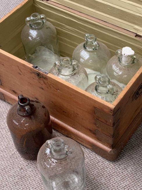 VINTAGE PINE BLANKET BOX with iron handles, 38cms H, 73cms W, 42cms D and a quantity of glass demi-johns (7)