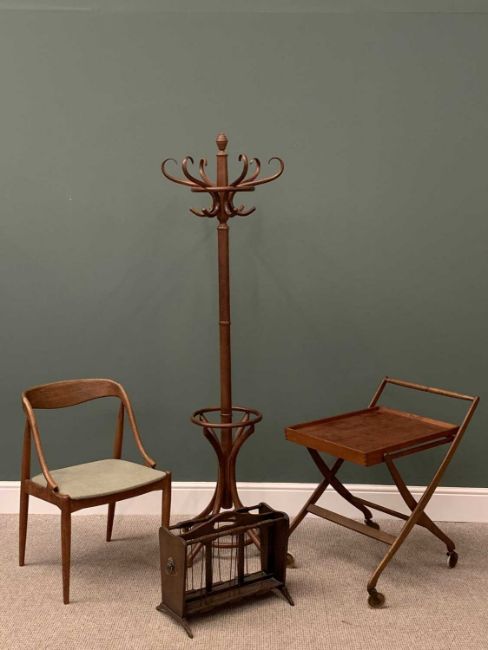 MID CENTURY & OTHER TYPE FURNITURE ASSORTMENT to include bentwood hat and coat stand,, 186cms H, teak type dining chair, tea trolley and a magazine rack