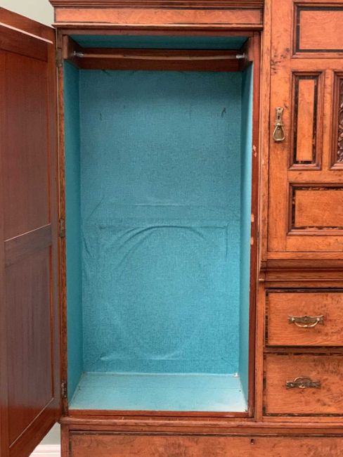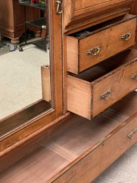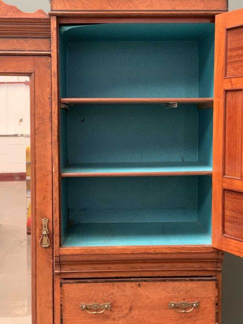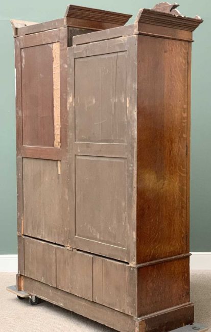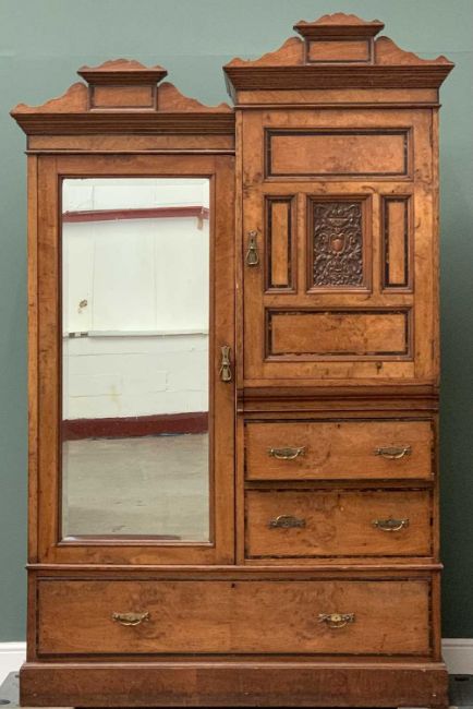 EDWARDIAN POLLARD TYPE OAK COMBINATION WARDROBE, having a single mirrored door, carved detail to a panel door over two small drawers and a base drawer, 239cms H, 142cms W, 50cms D
