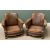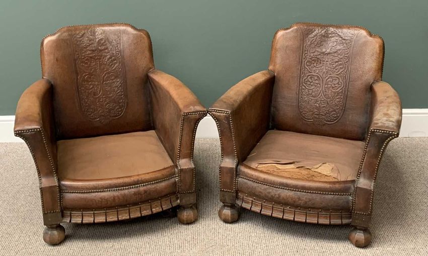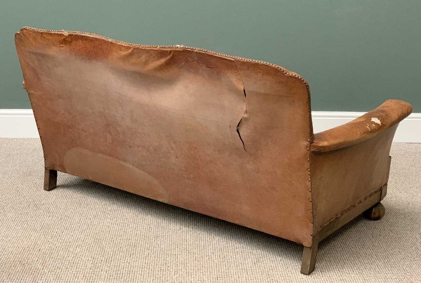 VINTAGE CLUB TYPE THREE PIECE SUITE comprising three seater sofa, 76cms H, 152cms W, 65cms D and two armchairs, 75cms H, 78cms W, 64cms D, leather upholstered with loose cushions and studded detail