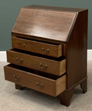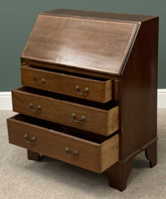 VICTORIAN MAHOGANY INLAID BUREAU having three drawers, on bracket feet, 97cms H, 76cms W, 43cms D
