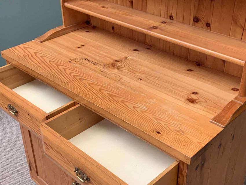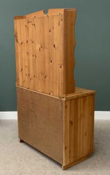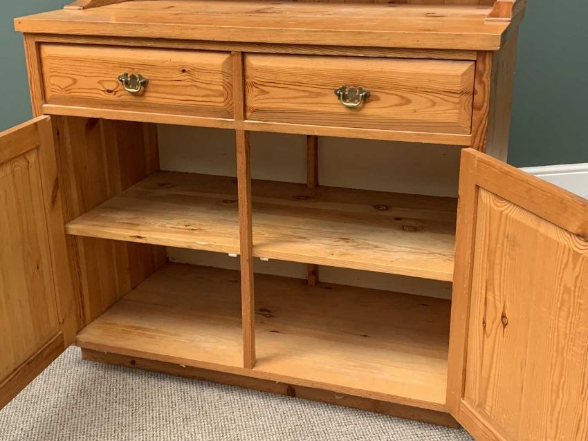 MODERN PINE DRESSER with three shelf shaped top rack and three drawers over two cupboard doors, 195cms H, 109cms W, 55cms D