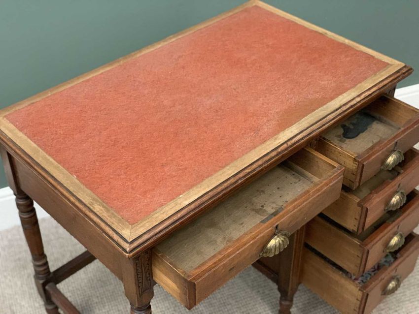 EDWARDIAN MAHOGANY KNEEHOLE DESK with single pedestal and vinyl tooled top, 78cms H, 92cms W, 56cms D