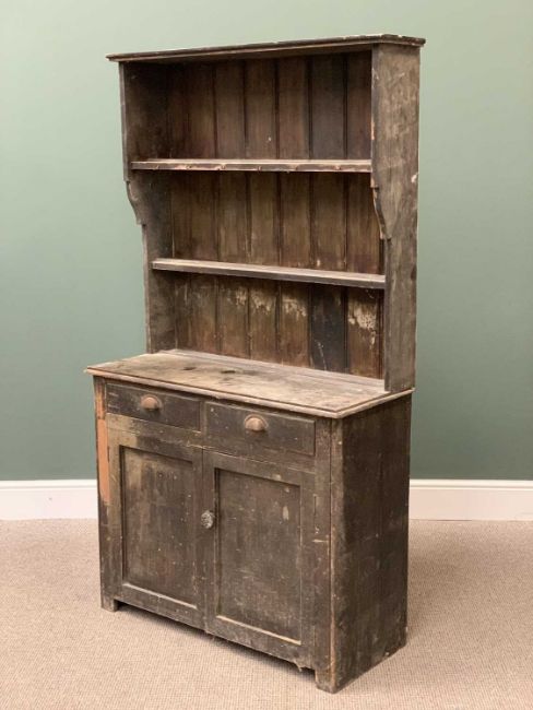 VINTAGE PINE DRESSER with two shelf rack, the base having two drawers over two cupboard doors, 184cms H, 99cms W, 43cms D