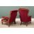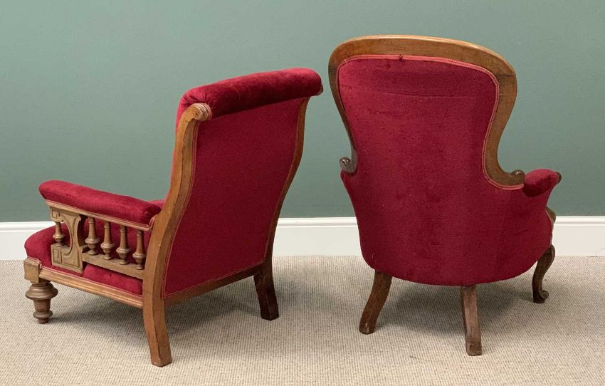 VICTORIAN MAHOGANY SPOONBACK ARMCHAIR with buttoned back, having scrolled arms and supports, 106cms H, 73cms W, 52cms D and a similarly upholstered Edwardian oak armchair, 94cms H, 66cms W, 56cms D