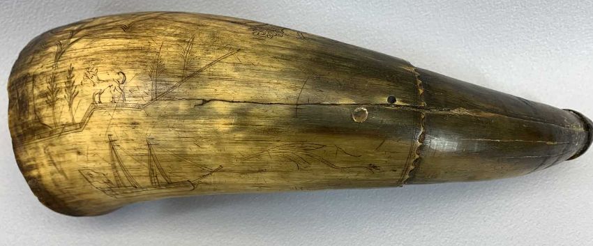 1783 DATED SCRIMSHAW WORK HORN - carved with Imperial Eagle, Heraldic flag, huntsman and dog, twin masted ship and floral sprays, 29cms across