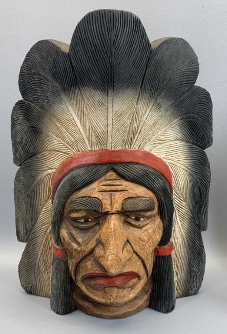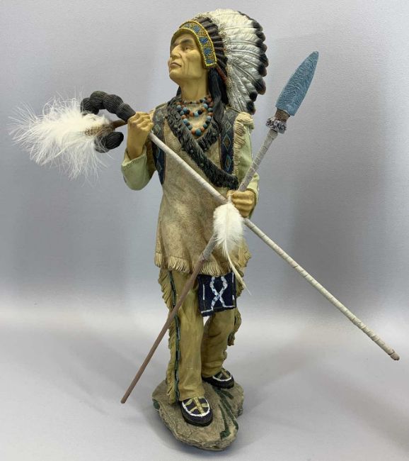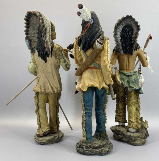 COMPOSITION AMERICAN INDIAN STANDING FIGURINES (3), two further on horseback and a carved wooden mask in full feather headdress, 52cms H the tallest figurine, 57 x 42cms the standing mask